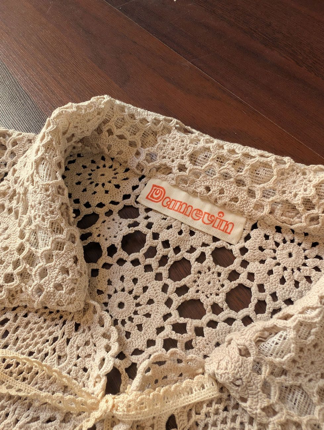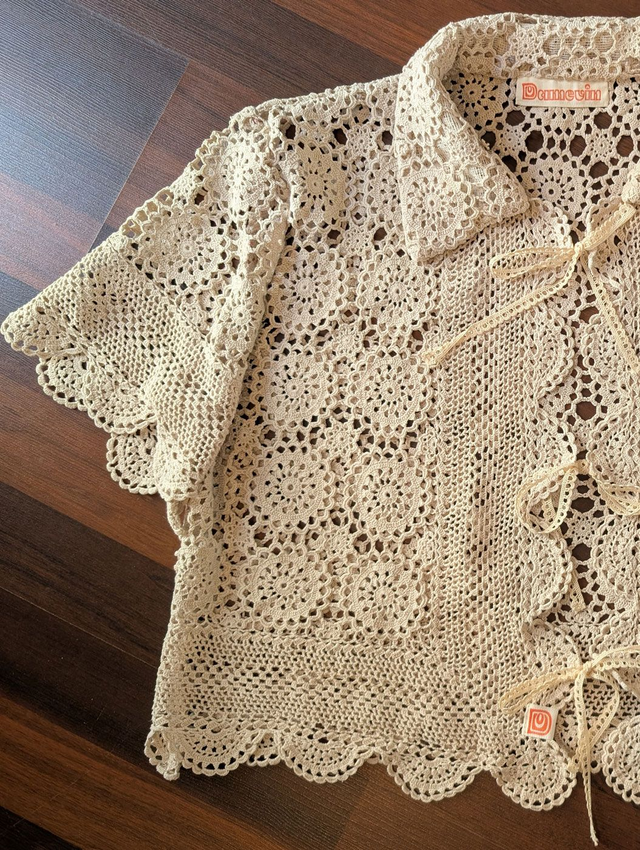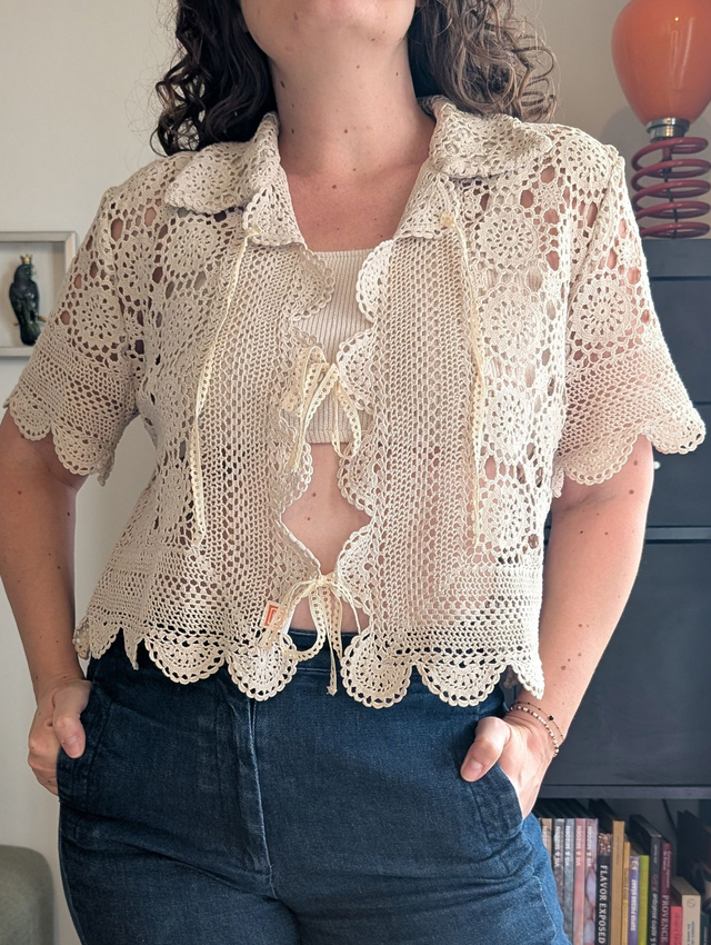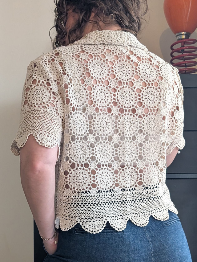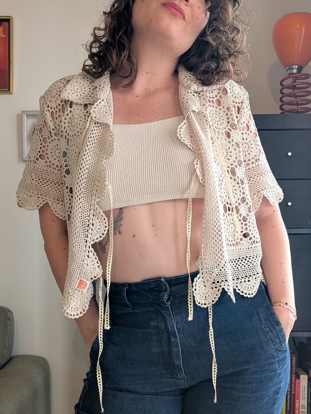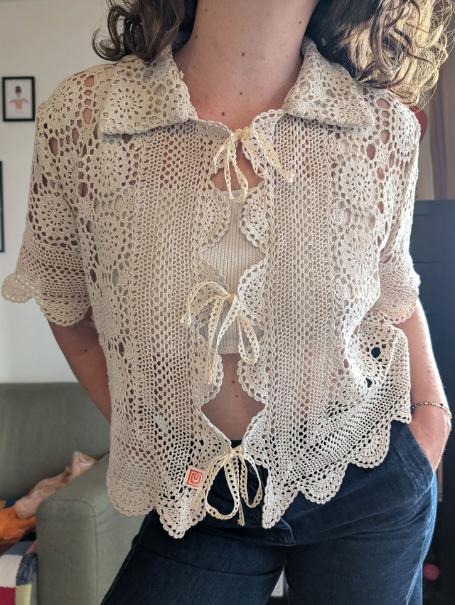 Ici, un modèle cousu dans une incroyable nappe en crochet entièrement faite à la main, liens en ruban de dentelle qui s'accorde parfaitement. Modèle "presque unique" (une 2ème blouse est déjà adoptée, mais la longueur et le col diffèrent légèrement).