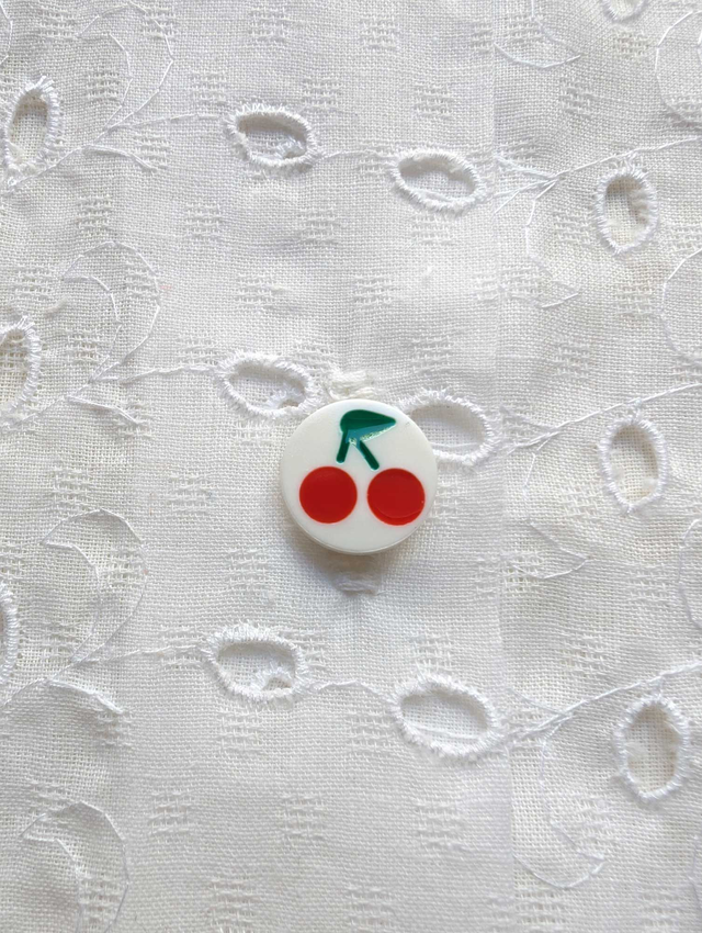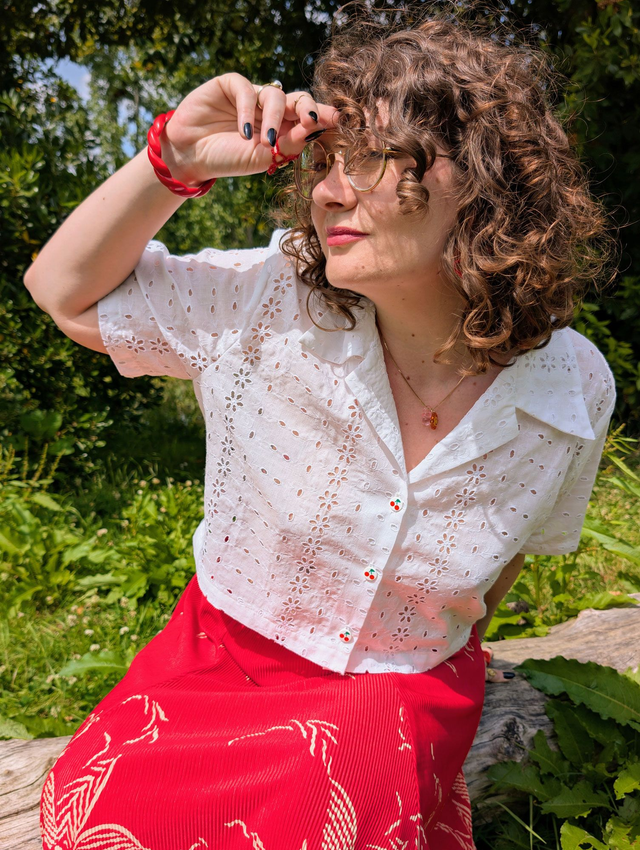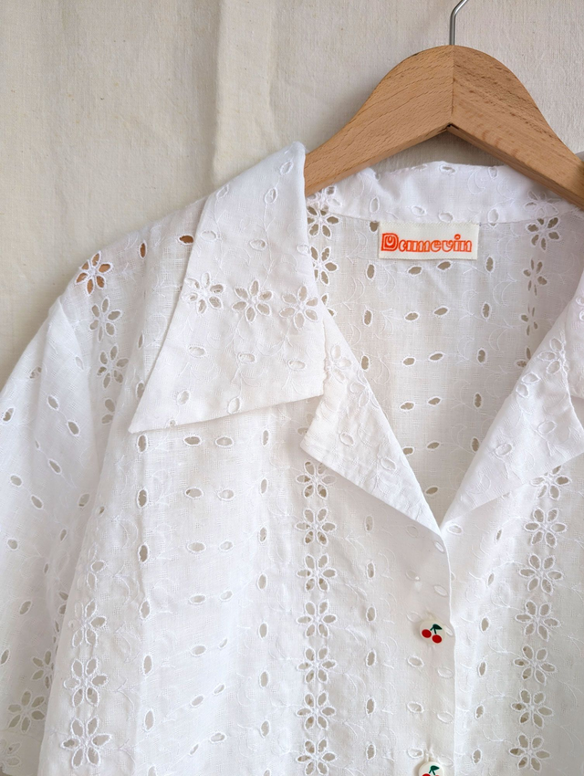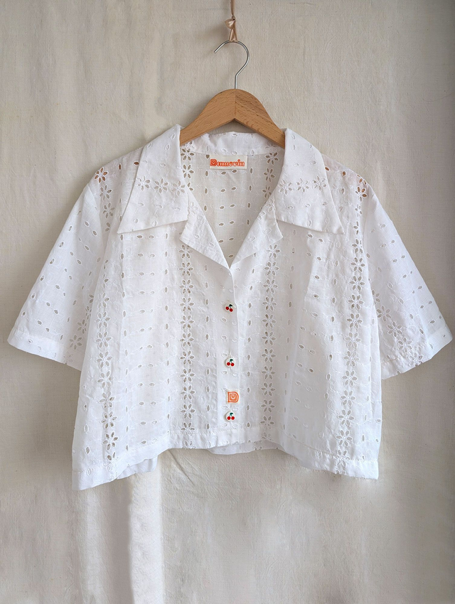 Cette chemise se décline dans un délicat coton blanc en broderie anglaise. Zoom sur le détail des boutons cerises 70's. Mini-série : possibilité d'en réaliser un 2ème, voire un 3ème😉.