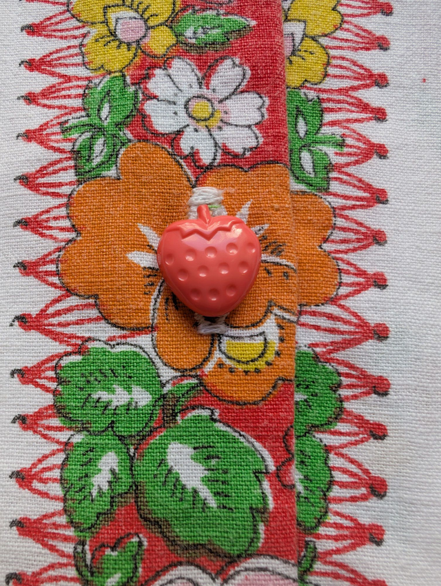 Ce modèle est réalisé avec une nappe en coton à motif floral très printanier. Zoom sur le détail des boutons en forme de fraise. Modèle unique, il n'y en aura pas deux !