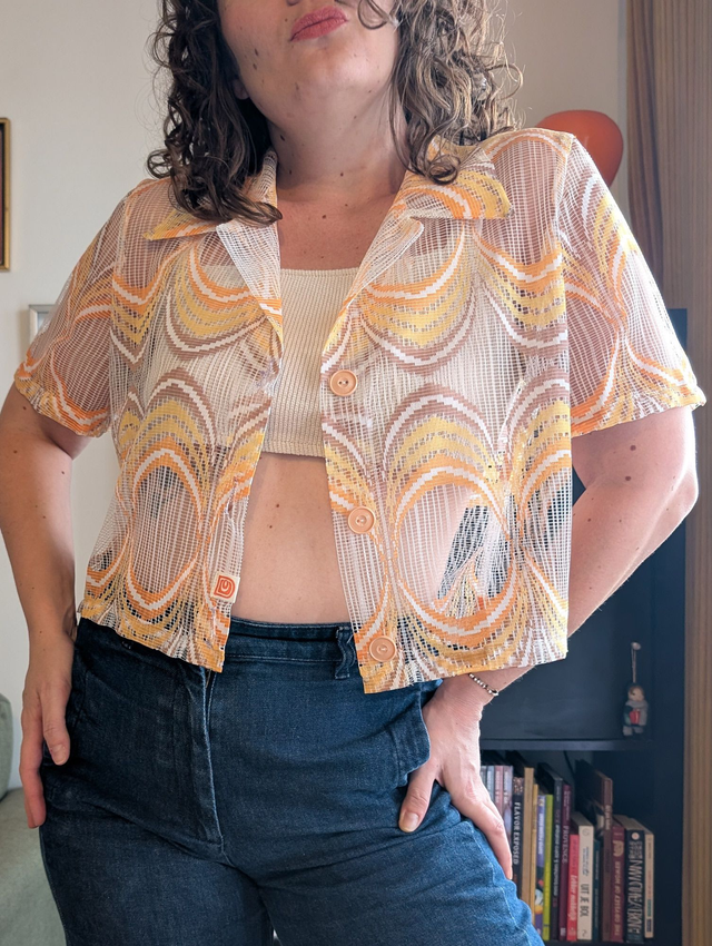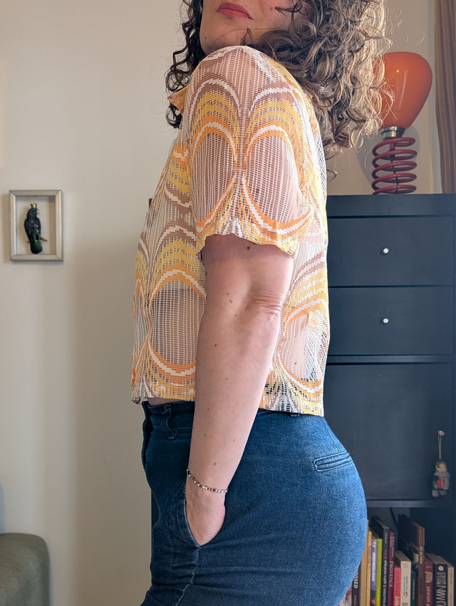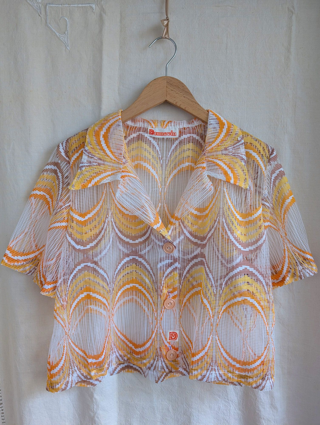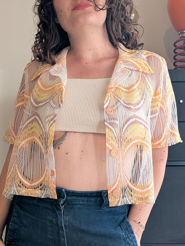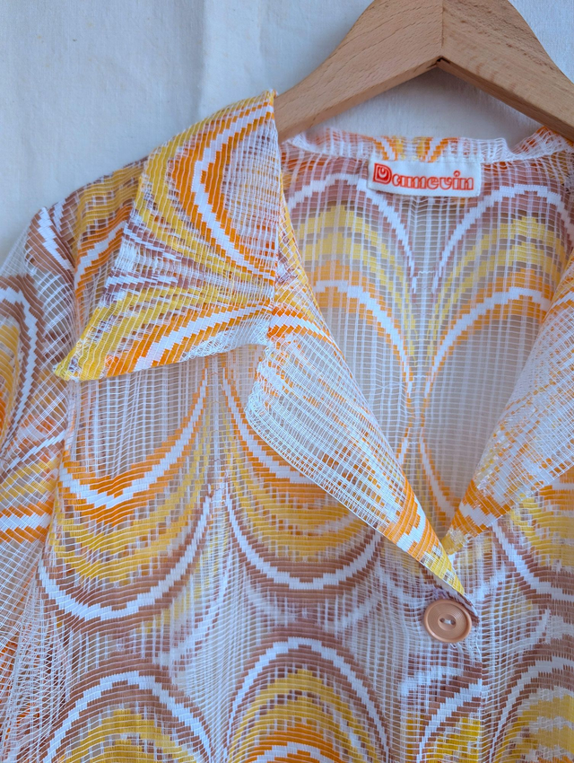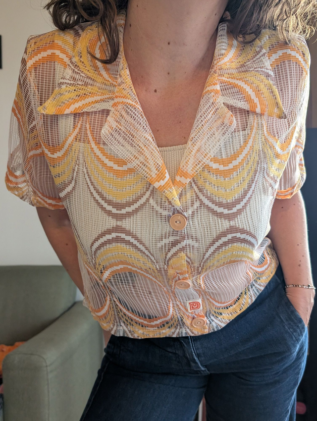 Ici le modèle est réalisé à partir d'un sublime rideau des années 70, en une sorte de résille très légère et agréable à porter.