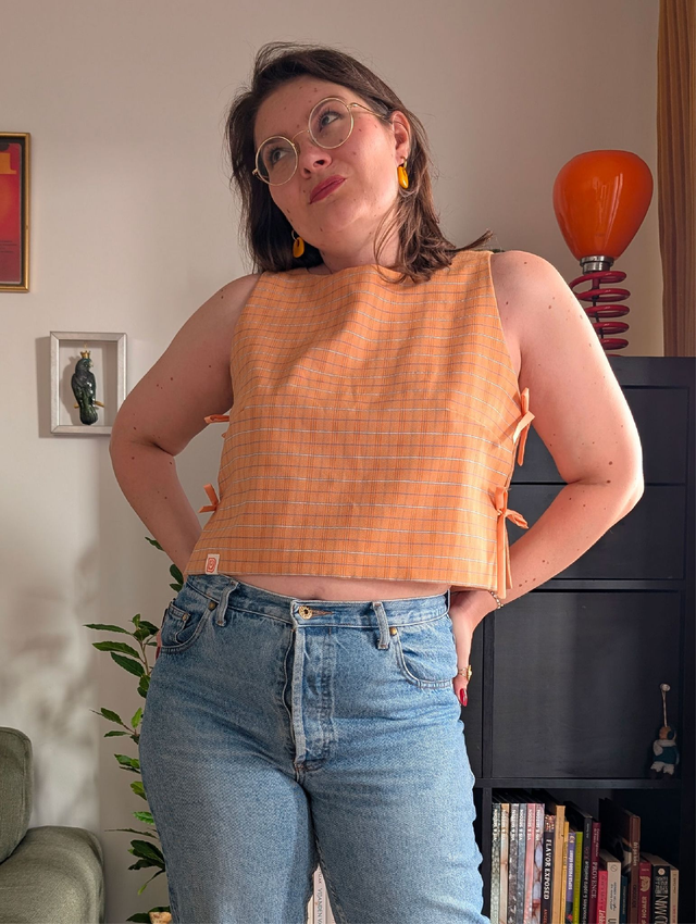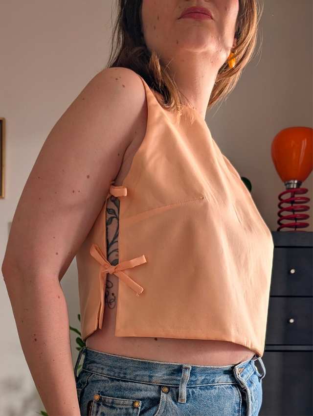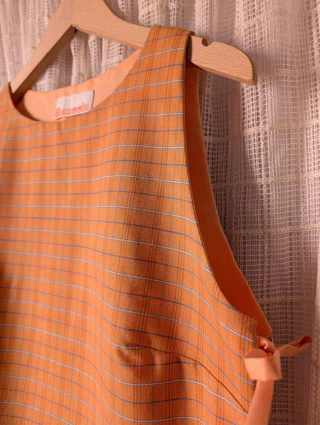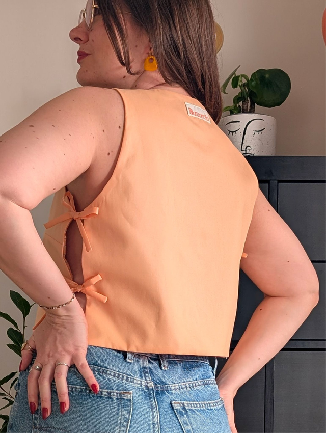 Léger, sans manche, avec un tombé droit et de fins liens à nouer sur le côté. Entièrement cousu à la main avec des tissu anciens chinés.