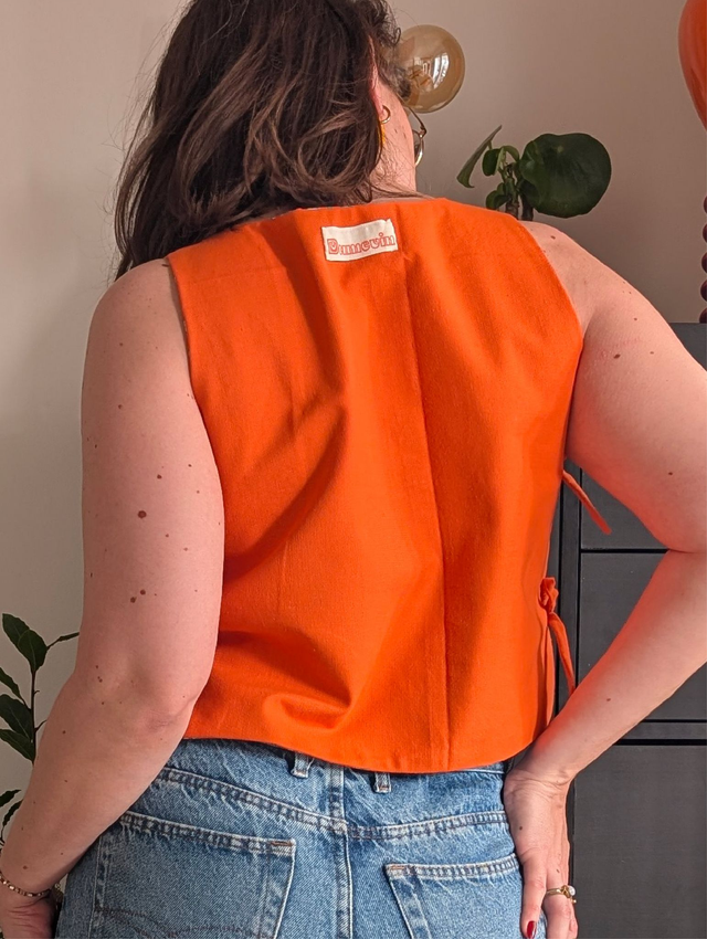Léger, sans manche, avec un tombé droit et de fins liens à nouer sur le côté. Entièrement cousu à la main avec des tissu anciens chinés.