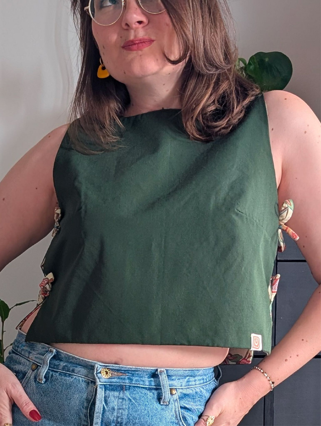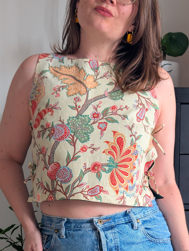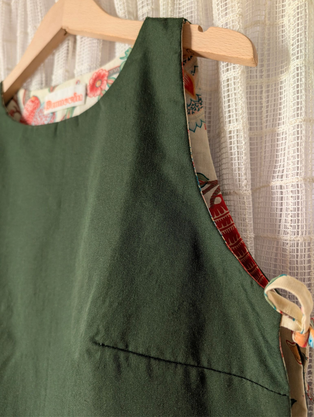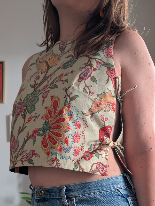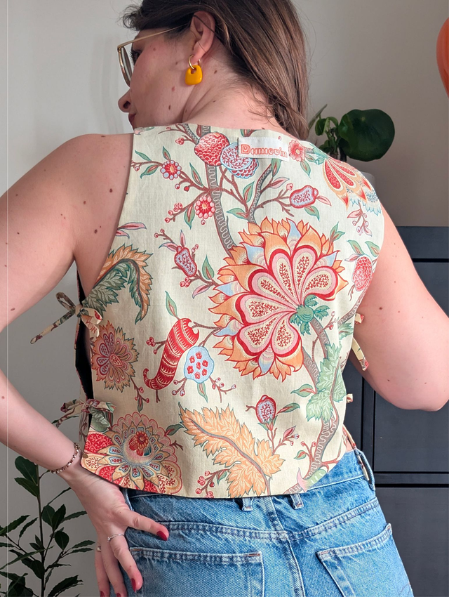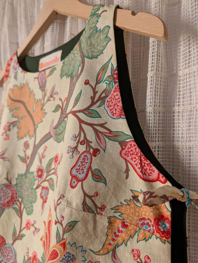 Léger, sans manche, avec un tombé droit et de fins liens à nouer sur le côté. Entièrement cousu à la main avec des tissu anciens chinés.
